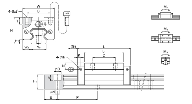 | 型号 | 导轨尺寸 | 基本额定负荷 | 容许静力矩 | 重量 | ||||||||||