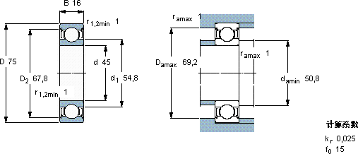 | 45 | 75 | 16 | 22,1 | 14,6 | 0,64 | 20000 | 10000 | 0,25 | 6009-2Z * | |