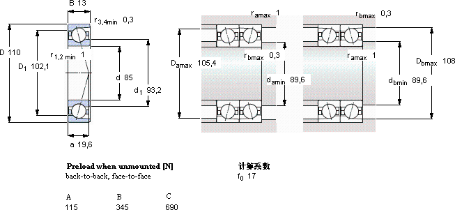 | 主要数据尺寸 | 基本负荷额定值 | 疲劳负荷限值 | 可达到的速度 | 体积 | 型号 |