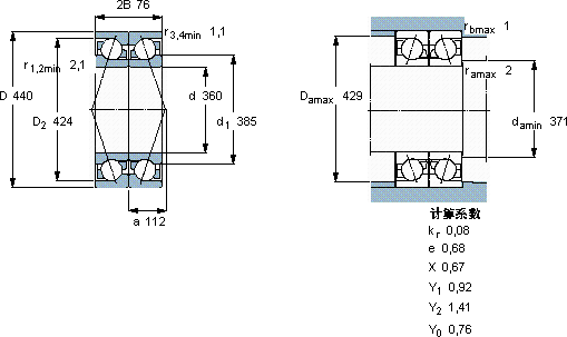 角接触球轴承, 单列,用于配对安装, 背对背配对