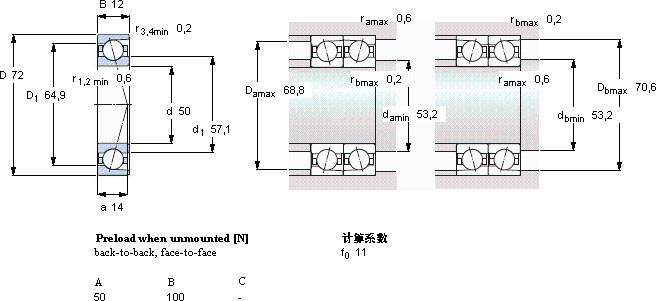 | 50 | 72 | 12 | 13,5 | 10,4 | 0,44 | 22000 | 34000 | 0,11 | 71910 CD/HCP4A | - | |