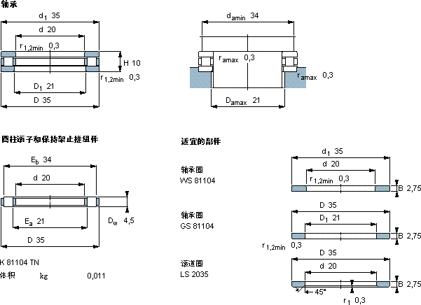 | 20 | 35 | 10 | 18,6 | 48 | 4,65 | 0,00018 | 3800 | 7500 | 0,037 | 81104 TN | K 81104 TN | |