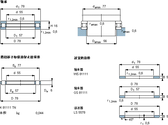 | 55 | 78 | 16 | 69,5 | 285 | 29 | 0,0065 | 1900 | 3800 | 0,22 | 81111 TN | K 81111 TN | |