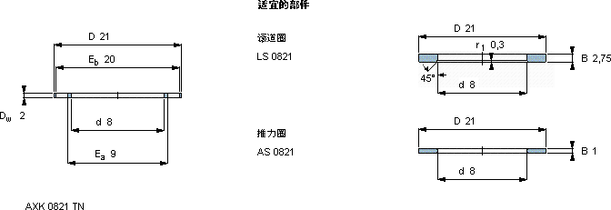 | 滚针推力轴承, 滚针与保持架推力组件 and bearings with centring spigot, 滚针与保持架推力组件 | ||||||||||