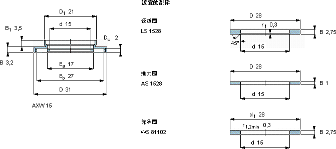 | 滚针推力轴承, 滚针与保持架推力组件 and bearings with centring spigot, with a centring spigot | ||||||||||