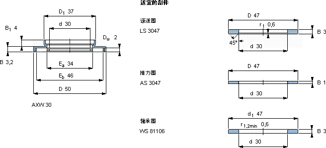 | 滚针推力轴承, 滚针与保持架推力组件 and bearings with centring spigot, with a centring spigot | ||||||||||
