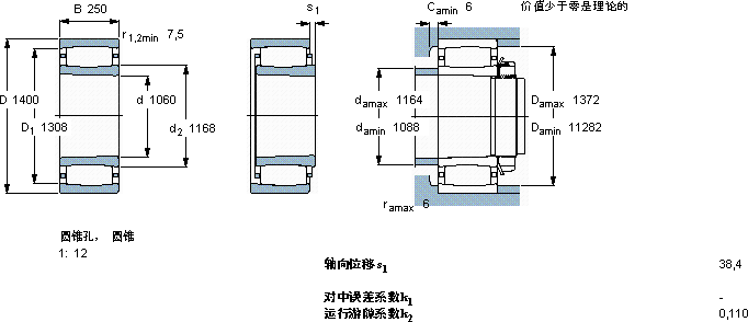 | CARB圆环滚子轴承, 圆柱和圆锥孔, 圆锥型内孔, 与保持架 | |||||||||||