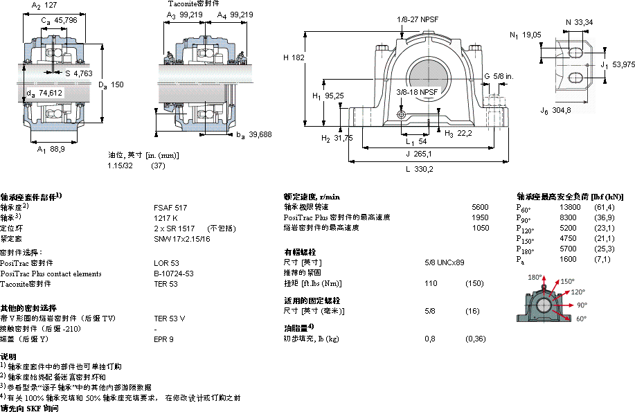 | 型号 | 基本负荷额定值, | 主要数据尺寸 | 迷宫密封件 | PosiTrac 密封件 | PosiTrac Plus密封件 | Taconite密封件 | |||||