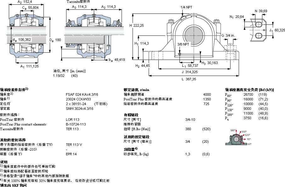 | 型号 | 基本负荷额定值, | 主要数据尺寸 | 迷宫密封件 | PosiTrac 密封件 | PosiTrac Plus密封件 | Taconite密封件 | |||||