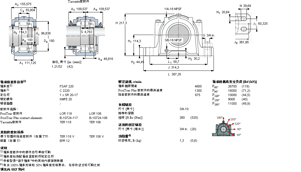 | 型号 | 基本负荷额定值, | 主要数据尺寸 | 迷宫密封件 | PosiTrac 密封件 | PosiTrac Plus密封件 | Taconite密封件 | |||||