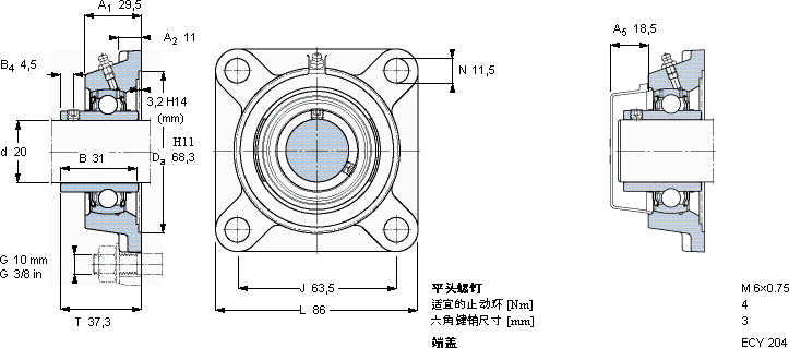 | Y-型轴承带法兰单元, 方形铸造轴承座,平头螺钉锁定, 公制轴承 |