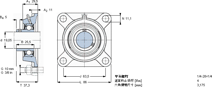 | Y-型轴承带法兰单元, 方形铸造轴承座,平头螺钉锁定, 英制轴承 |