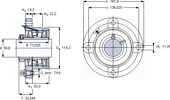 | 带法兰的滚子轴承单元, 锁定套和插口,用于英制的轴, locating units, general conditions (double-lip seals) | |