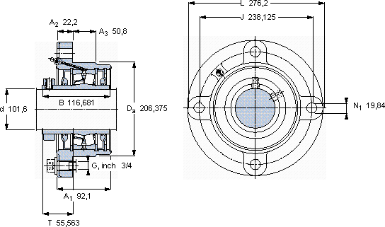 | 带法兰的滚子轴承单元, 锁定套和插口,用于英制的轴, locating units, general conditions (double-lip seals) | |