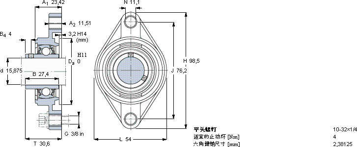 | Y-型轴承带法兰单元, 铸造轴承座 ,椭圆形法兰,平头螺钉锁定,可用于空气调节系统 |