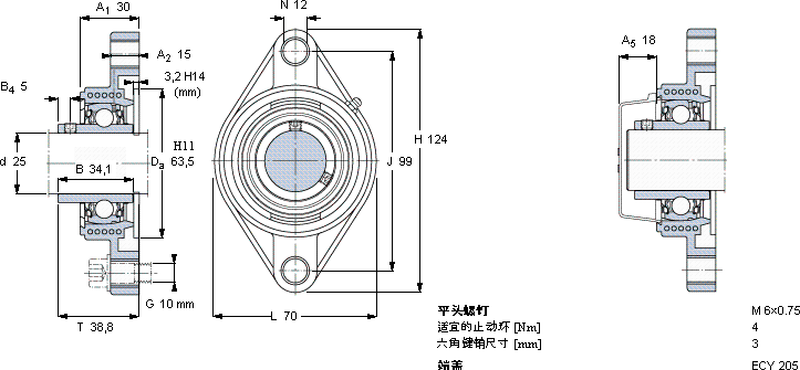 | Y-型轴承带法兰单元, Y-技术,椭圆轴承座,平头螺钉锁定,食品级用油脂 | ||||||||||||