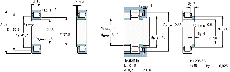| 30 | 62 | 16 | 44 | 36,5 | 4,55 | 13000 | 14000 | 0,24 | NJ 206 ECP * | HJ 206 EC | ||