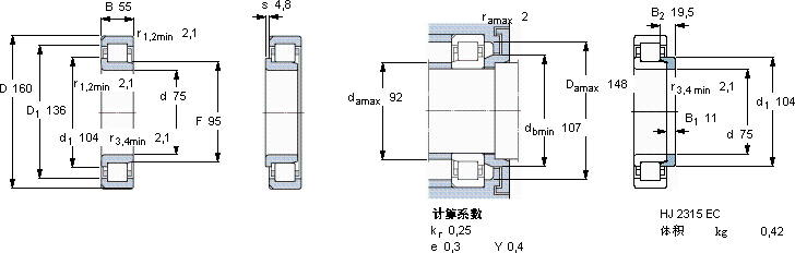 | 圆柱滚子轴承, 单列, NJ 设计, 于外圈的两个带定位槽 | ||||||||||||