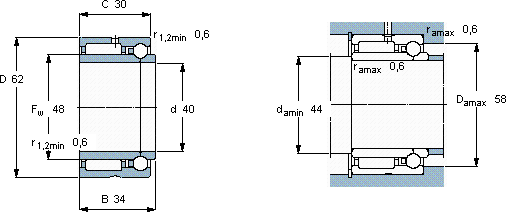 | 组合式滚针轴承, 滚针/角接触球轴承, 轴向负荷 双向 | |||||||||||||
