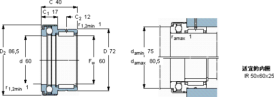 | 60 | 72 | 40 | 41,8 | 96,5 | 41,6 | 122 | 11,8 | 4,55 | 0,077 | 3600 | 3000 | 0,38 | NKX 60 Z | |