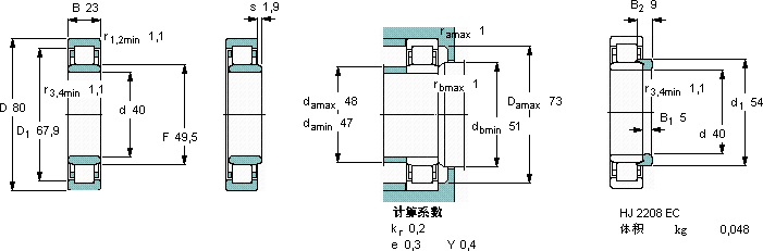 | 40 | 80 | 23 | 81,5 | 75 | 9,65 | 9500 | 11000 | 0,54 | NU 2208 ECP * | HJ 2208 EC | ||