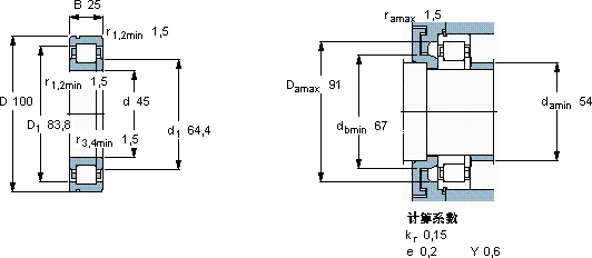 | 主要数据尺寸 | 基本负荷额定值 | 疲劳负荷限值 | 额定速度 | 体积 | 型号 | 适宜的斜挡圈 | ||||||