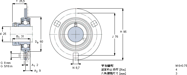 | Y-型轴承带法兰单元, 冲压钢轴承座,偏心锁定轴环, 带一个圆形法兰和三或四个螺栓孔, 公制轴承 |