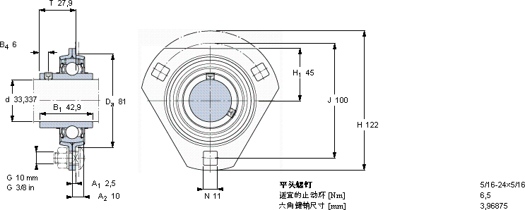 | Y-型轴承带法兰单元, 冲压钢轴承座,平头螺钉锁定 |