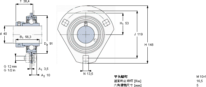 | Y-型轴承带法兰单元, 冲压钢轴承座,偏心锁定轴环, 带一个三角形法兰和三个螺栓孔, 公制轴承 | ||||||||||||
