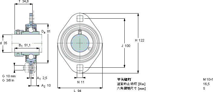| Y-型轴承带法兰单元, 冲压钢轴承座,偏心锁定轴环, 带一个椭圆形法兰和两个螺栓孔, 公制轴承 |