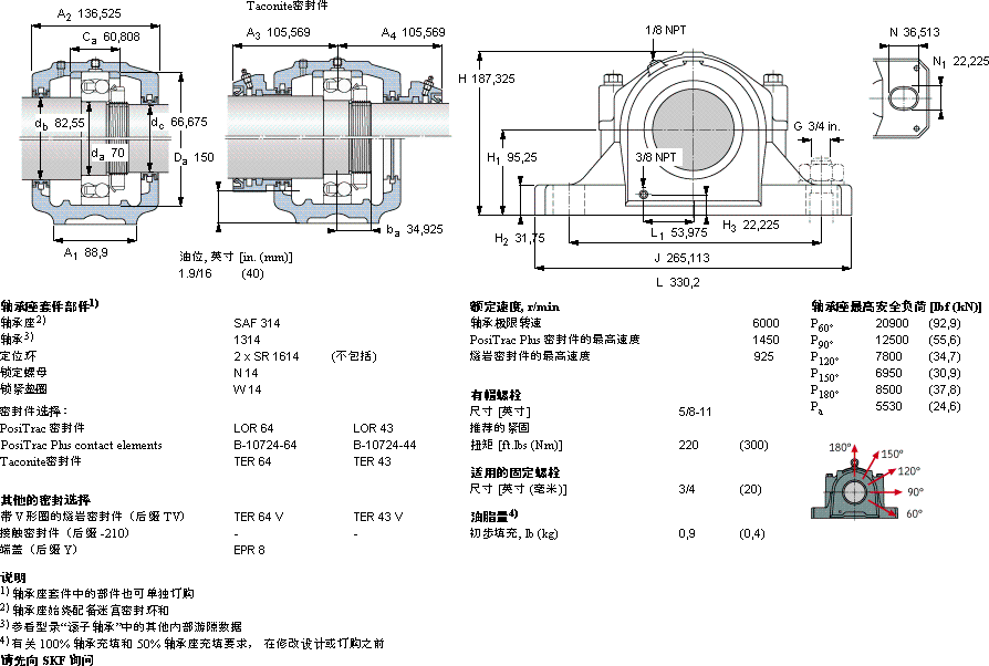 | 型号 | 基本负荷额定值, | 主要数据尺寸 | 迷宫密封件 | PosiTrac 密封件 | PosiTrac Plus密封件 | Taconite密封件 | |||||