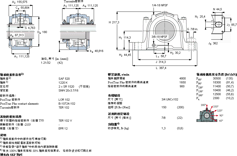 | | 型号 | 基本负荷额定值, | 主要数据尺寸 | 迷宫密封件 | PosiTrac 密封件 | PosiTrac Plus密封件 | Taconite密封件 |