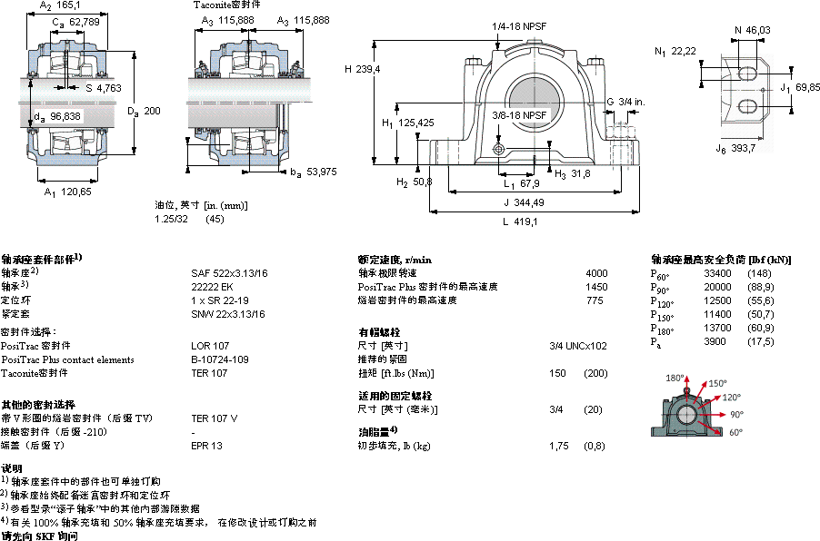 | | 型号 | 基本负荷额定值, | 主要数据尺寸 | 迷宫密封件 | PosiTrac 密封件 | PosiTrac Plus密封件 | Taconite密封件 |
