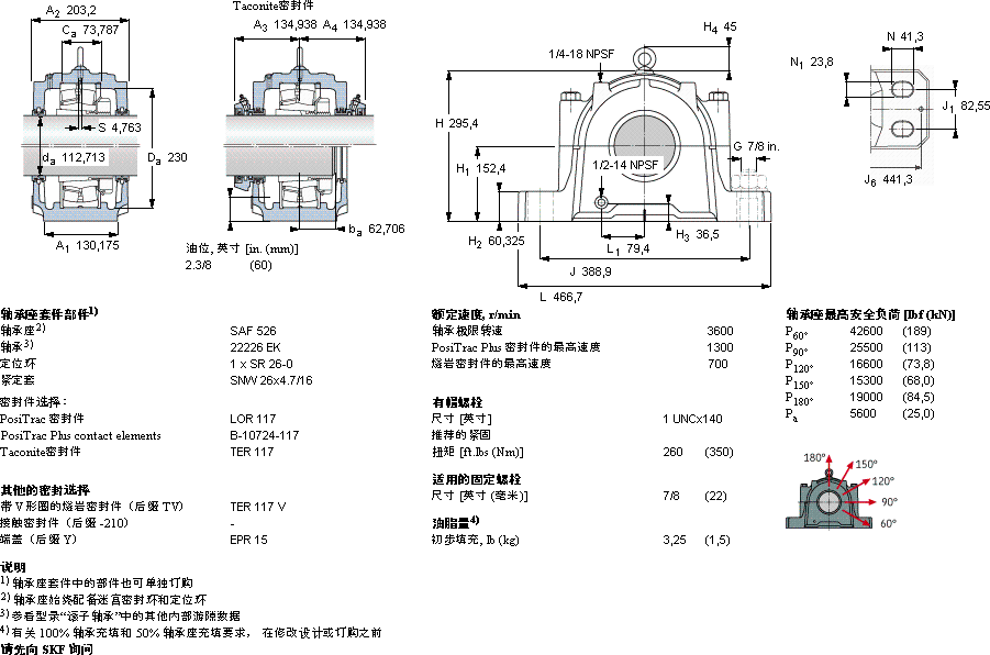 | 型号 | 基本负荷额定值, | 主要数据尺寸 | 迷宫密封件 | PosiTrac 密封件 | PosiTrac Plus密封件 | Taconite密封件 | |||||