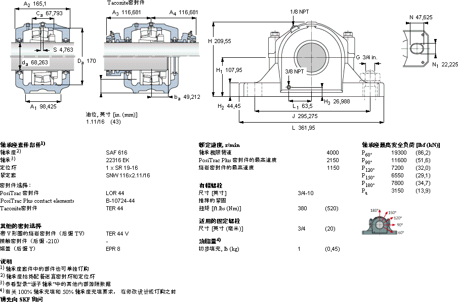 | 型号 | 基本负荷额定值, | 主要数据尺寸 | 迷宫密封件 | PosiTrac 密封件 | PosiTrac Plus密封件 | Taconite密封件 | |||||