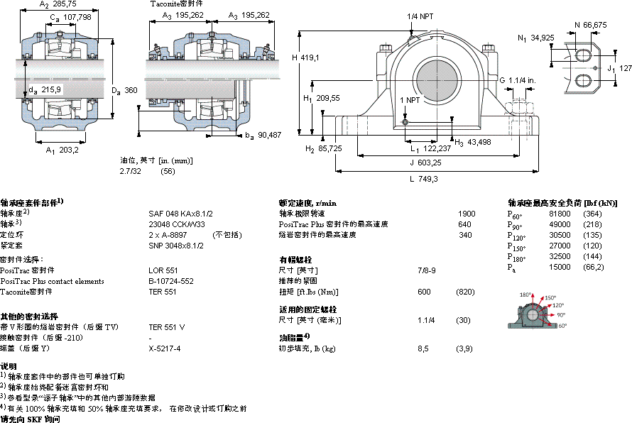 | 型号 | 基本负荷额定值, | 主要数据尺寸 | 迷宫密封件 | PosiTrac 密封件 | PosiTrac Plus密封件 | Taconite密封件 | |||||