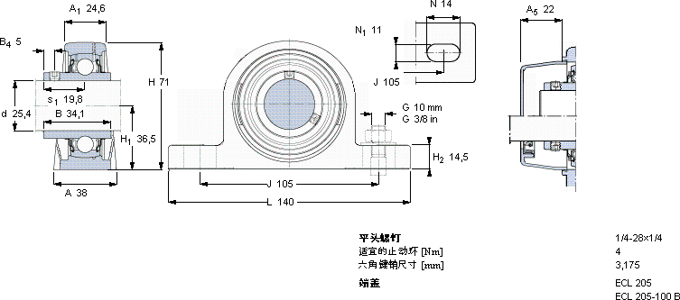 | Y-型立式轴承座单元, 聚酯轴承座,平头螺钉锁定,可用于食品行业的滑脂, 英制轴承 | ||||||||||||